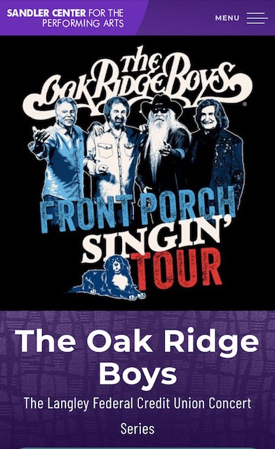 2 tickets to see the Oak Ridge Boys at the Sandler Center for Performing Arts. The date of the show is January 27, 2023.
