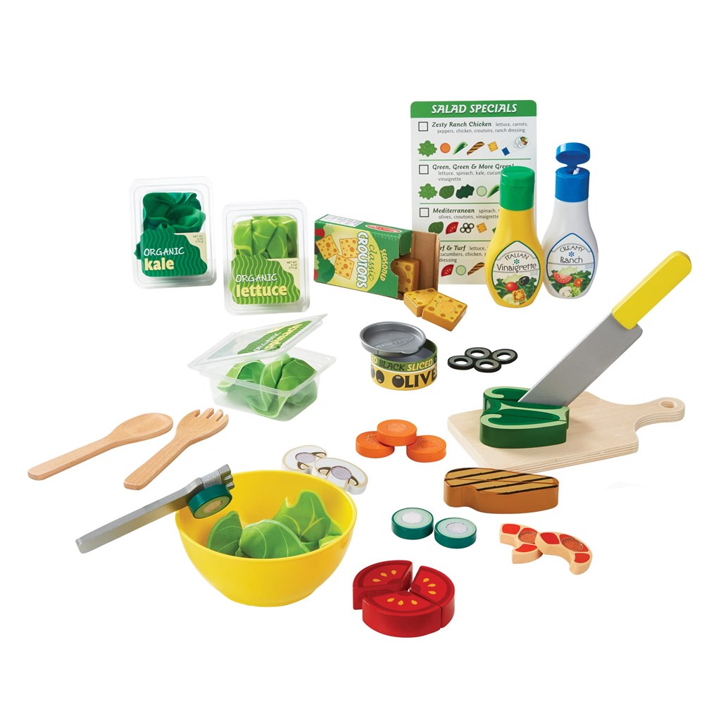 Pasta Set: Prepare perfect pretend pasta every time with this 50-plus-piece pasta-making set! Fun pasta boxes hold felt penne, bow tie pasta, linguini, and ravioli pockets that can be hand-stuffed with felt spinach, meat, or cheese fillings. Follow the illustrated guide to order and "cook" the pasta in the large cook pot with lid, and "strain" it in the colander over the cooktop and sink play mat. Use the pasta spoon to scoop into the included pasta bowl, top with tomato sauce, cheese, or, butter toppings, and dig in! The set also includes a sauce jar, cheese shaker, salt shaker, and fork. This inventive set lets kids create countless imaginative pasta meals from start to finish! Salad Set: Make sensational pretend play salads fresh to order! The all-inclusive 52-piece set includes felt salad greens (kale, lettuce, and spinach) in hinged containers, and slice-able wooden vegetables (carrots, tomatoes, cucumbers, mushrooms, and green peppers), proteins (shrimp and grilled chicken), and toppings (olives and croutons). For the finishing touch, two salad dressing bottles "squirt" string! Place an order on the reusable menu card, slice ingredients with a wooden knife on the cutting board, toss with wooden salad utensils in the bowl, and then enjoy a fresh salad using the fork with self-stick tabs. Kids and parents alike will love this healthy way to play!