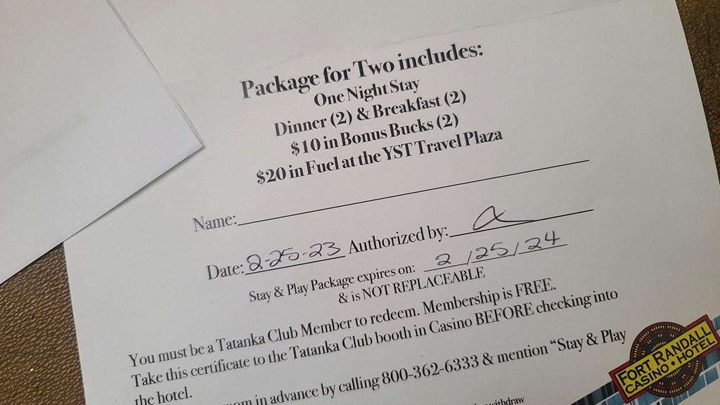 Enjoy a one night stay along with dinner and breakfast for two at the Fort Randall Casino & Hotel in Pickstown, South Dakota (10 miles west of Wagner, SD). Courtesy of Fort Randall Casino. Expires 2/25/2024 Hotel: $96 Dinner $40 Breakfast $20 $20 bonus bucks $20 fuel