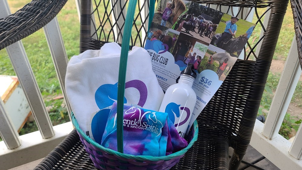 Enjoy an annual membership to the Gentle Spirit Horses educational children's program, the Bug Club (http://gshbugclub.com). Membership includes access to the Hands On days at the farm as well as a t-shirt (correct size for the child will be provided). Basket also includes a certificate to order a Bug Club sweatshirt from GSH Tack and a stainless steel Bug Club water bottle.