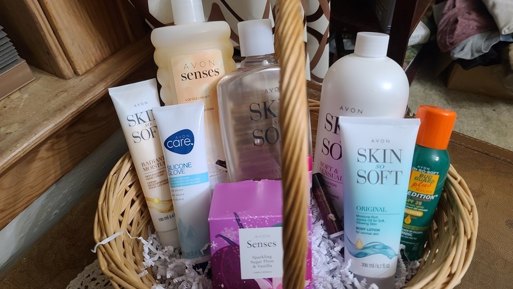 A collection of Avon products designed to pamper you! Basket includes: Avon Senses Candle - Sparkling Sugar Plum and Vanilla ($20) Skin So Soft Soft & Sensual Body Lotion ($11) Skin So Soft Radiant Moisture Bath Oil ($24) Skin So Soft Soft & Sensual Replenishing Hand Cream ($5) Skin So Soft Original Body Lotion ($6) Skin So Soft Bug Guard Plus IR3535® Expedition™ Aerosol Spray SPF 28 ($20) Avon Senses Vanilla Cream Bubble Bath ($11) Avon Care Silicone Glove Protective Hand Cream ($6) Dew Kiss Lip Balm ($2) Skin So Soft Supreme Nourishment Coconut Oil Lip Balm ($2)