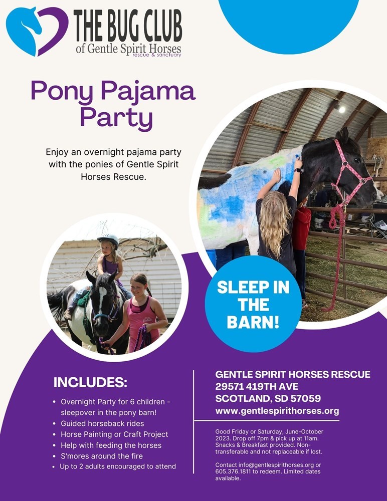 Enjoy an overnight pajama party for up to six children with the ponies of Gentle Spirit Horses Rescue. Enjoy guided horseback rides, horse painting or a craft project, help with feeding the horses, S'mores around the firepit, and sleep in the barn with the ponies! Up to 2 adults encouraged to attend. Good Friday or Saturday, June-October 2023. Drop off 7pm & pick up at 11am. Snacks & Breakfast provided. Non-transferable and not replaceable if lost.