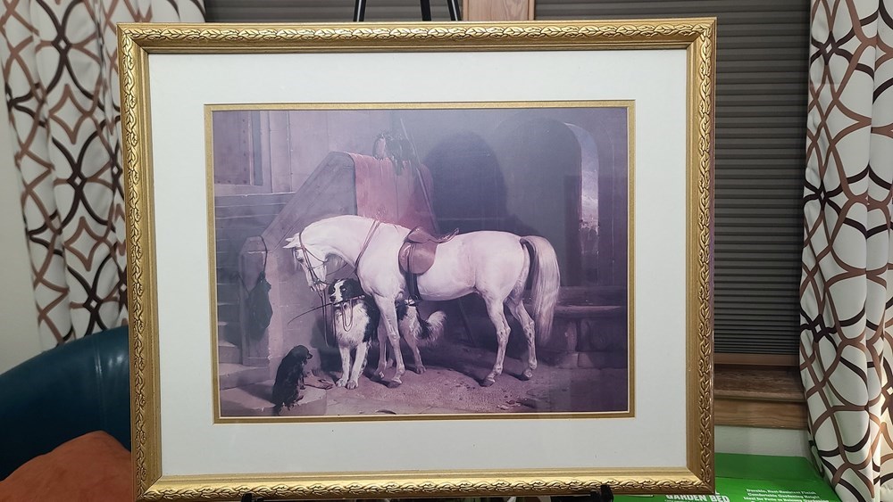 Beautiful framed reproduction art print by British artist Sir Edwin Landseer. Titled Prince George’s Favorites 1802-1873. Ornate gold frame with leaf motif approximately 18x21”