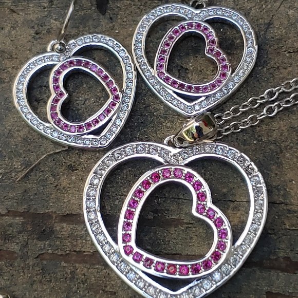 Love's First Blush Heart Jewelry Set by Montana Smith in a hand tooled wooden box. Earrings hang on hypoallergenic French hooks. A slightly larger necklace pendant hangs on a princess length 19 inch chain.