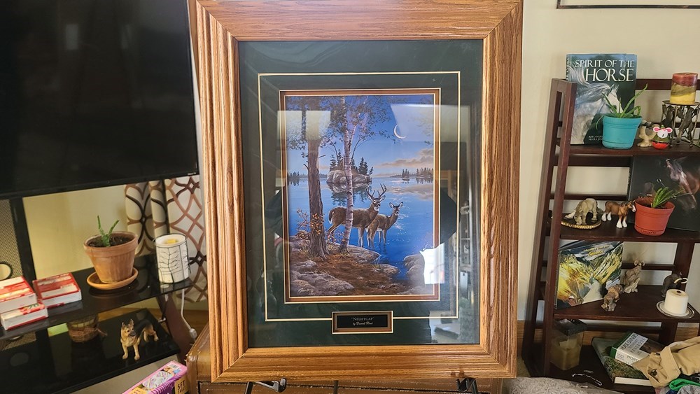 Matted and Framed Print "Nightcap" by Darrell Bush. Total size 18x23". Two deer standing in a peaceful creek on a moonlight night.