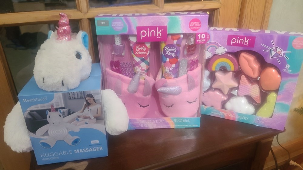 Pamper yourself with this cute unicorn spa package. Includes a huggable unicorn massager, a bunch of cute shaped bath bombs, unicorn slippers and lotions and other items to give yourself a spa day!